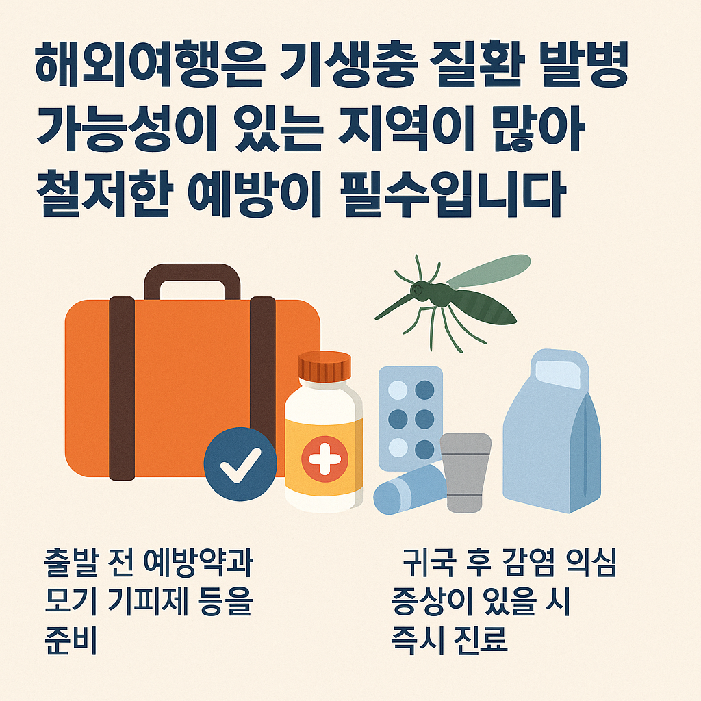 해외여행은 새로운 경험과 즐거움을 주지만, 기생충 질환과 같은 건강 위험도 함께 존재합니다. 특히 풍토병이 유행하는 지역에서는 사전 예방과 철저한 위생 관리가 필수입니다. 출발 전 예방약과 필요한 용품을 준비하고, 여행 중에는 물·음식 위생과 모기 차단에 신경 쓴다면 감염 위험을 크게 줄일 수 있습니다. 귀국 후에도 몸의 변화를 주의 깊게 살피고, 이상이 있으면 즉시 검사받는 습관이 중요합니다. 여러분은 해외여행 시 어떤 건강 준비를 하시나요? 댓글로 경험과 팁을 공유해 주세요.