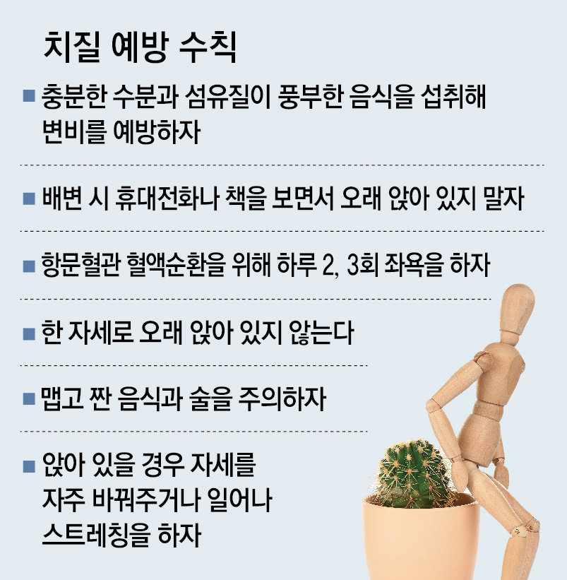 | 배변 시 스마트폰 사용 | 배변 시간이 길어져 항문 압력 증가 | 5분 이내 배변 마무리 |
