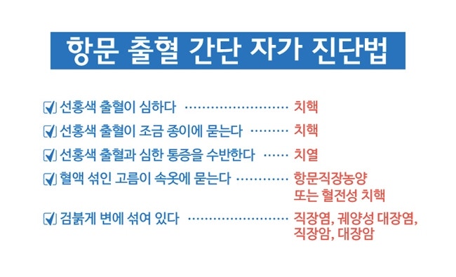 | 선홍색 | 치질, 치열, 직장암 | 변 위나 휴지에 묻음 |