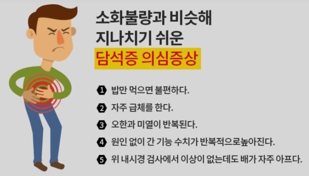 식사 후 오른쪽 윗배가 묵직하게 아프거나, 갑자기 찌르는 듯한 통증이 느껴진 적 있나요? 많은 사람들이 이런 증상을 단순한 소화불량이나 위장 문제로 생각하고 넘기지만, 사실 담석증의 초기 신호일 수 있습니다. 담석증은 담낭(쓸개)에 돌이 생겨 담즙 흐름을 방해하는 질환으로, 증상이 미약할 땐 그냥 지나치기 쉽지만 방치하면 급성 담낭염, 담관염, 췌장염까지 이어질 수 있습니다.