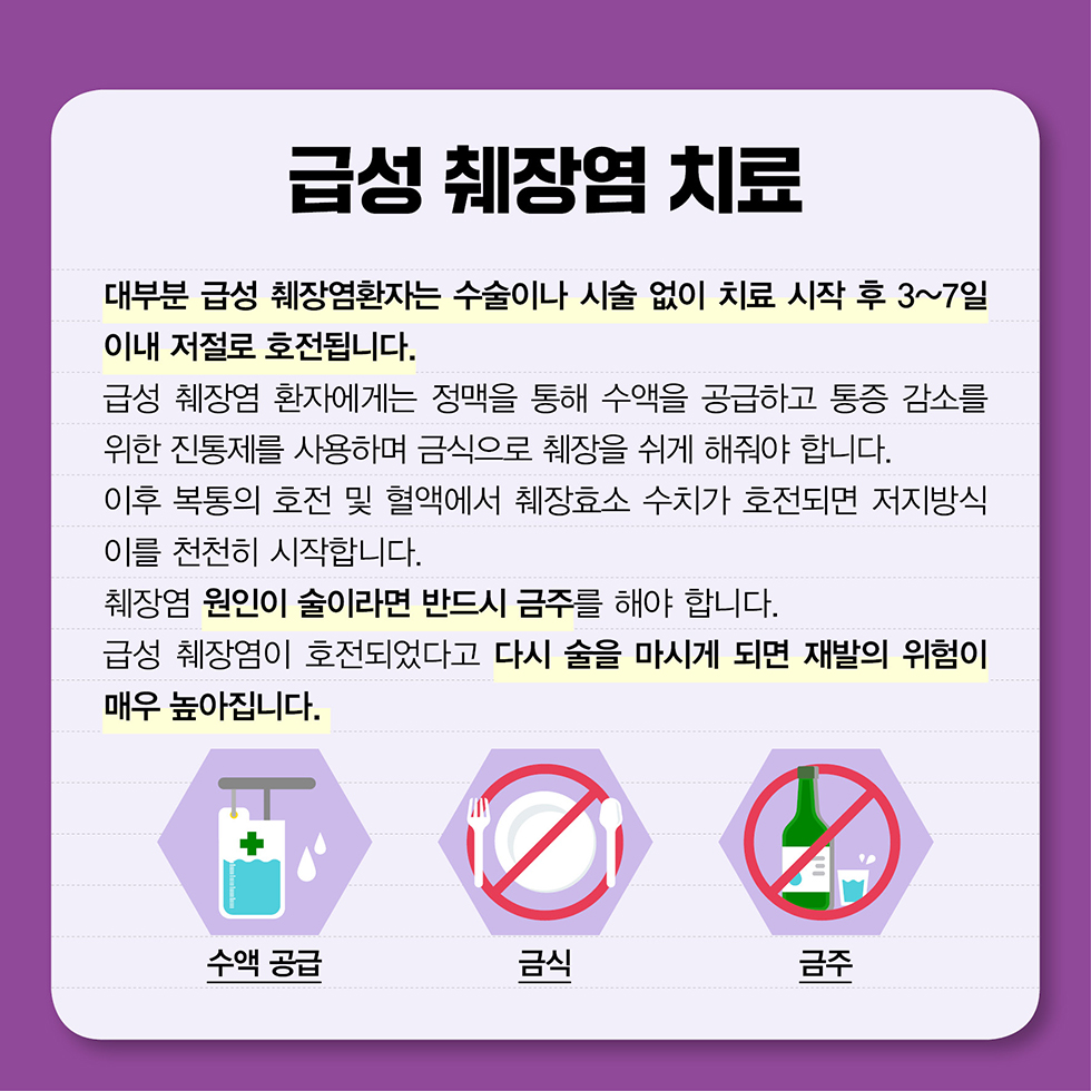 | 과음 | 알코올 대사 과정에서 췌장 손상 | 폭음 피하기, 금주 또는 절주 |