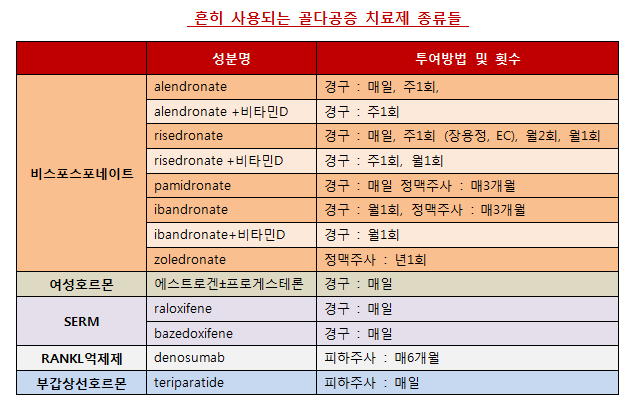 - 졸레드론산: 1년 단위로 맞아 편리하지만, 맞고 나서 몸살·근육통 부작용 가능
