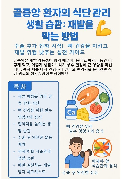 골종양 환자의 회복과 재발 방지는 병원 치료만으로 완성되지 않습니다. 수술 이후 어떻게 먹고, 어떻게 생활하느냐가 향후 건강을 좌우합니다. 균형 잡힌 식단과 안전한 운동, 위생과 수면 관리, 그리고 정기적인 검진이 모두 모여 재발 가능성을 낮추는 방패 역할을 합니다. 특히 무리한 다이어트나 불규칙한 생활은 뼈 건강과 면역력에 치명적이므로 피해야 합니다. 여러분의 생활 속 작은 변화가 1년 뒤, 5년 뒤 건강을 지키는 가장 확실한 방법이 될 수 있습니다. 오늘부터 하나씩 실천해보는 건 어떠신가요? 🙂