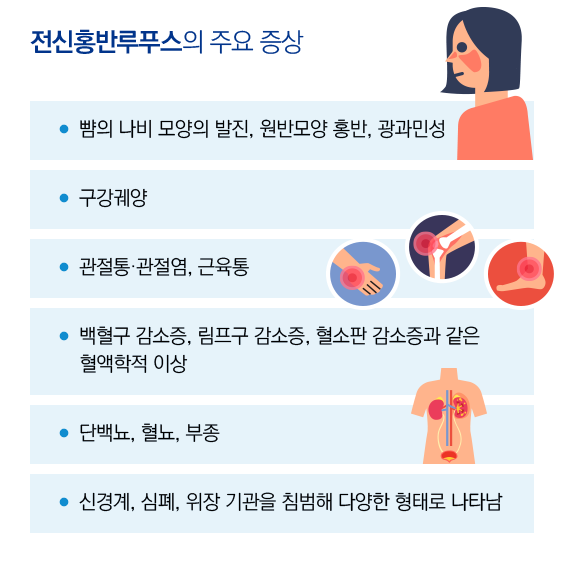 | 피부 | 나비 모양 발진 | 햇빛에 노출 시 심해짐 |