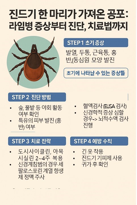 | 초기 (1~4주) | 발열, 두통, 근육통, 홍반(소위 ‘Bull’s eye rash’) | 진드기 물린 자리에 동심원 모양의 발진이 나타나는 경우 많음 |