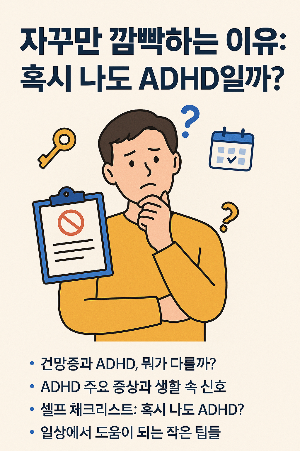 하루에도 몇 번씩 뭔가를 깜빡하는 일이 생기면 은근히 신경이 쓰이죠. 휴대폰을 어디에 뒀는지 몰라서 온 집안을 뒤지거나, 약속을 까맣게 잊어버려 난감해진 경험… 다들 한 번쯤 있으셨을 거예요. 근데 이게 단순한 건망증인지, 아니면 주의력결핍 과잉행동장애(ADHD)의 신호일 수도 있다는 얘기를 들으면 마음이 조금 복잡해지죠 ㅎㅎ. 사실 저도 지인이 비슷한 증상 때문에 고민했던 적이 있어서 더 관심 있게 보게 되더라구요. 그래서 오늘은 "자꾸 깜빡하는 이유"와 "혹시 나도 ADHD일까?"라는 주제를 파헤쳐 보겠심다!