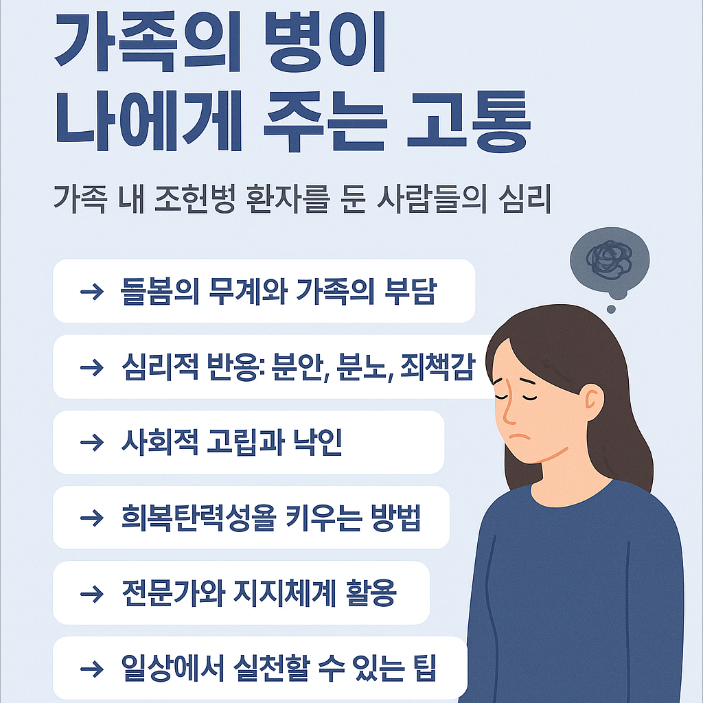 가족 중 한 명이 조현병을 앓게 되면, 환자 자신뿐 아니라 곁에서 지켜보는 가족의 삶도 크게 흔들립니다. 매일 반복되는 돌봄, 불안한 미래, 예기치 못한 증상들… 그 과정에서 남겨진 가족들은 눈에 보이지 않는 심리적 짐을 지게 됩니다. “왜 나만 이렇게 힘들까?”라는 생각, “끝이 보이지 않는다”는 막막함은 많은 가족들이 공통적으로 겪는 마음이라고 알려져 있어요.