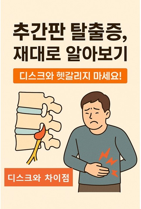 사실 "디스크"라는 말은 병명이 아니라 추간판 그 자체를 가리키는 말이에요. 추간판 탈출증은 그 디스크가 손상되면서 수핵이 밖으로 흘러나와 신경을 누르는 질환을 의미하죠. 즉, 디스크는 구조물, 추간판 탈출증은 질병이에요. 일상적으로 “디스크 걸렸다”라고 표현하지만, 정확히는 “추간판 탈출증”이라고 말하는 게 맞습니다. 이 차이를 알아야 올바른 이해와 치료 접근이 가능해요. 😉