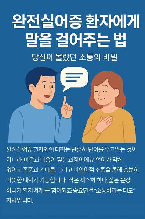 완전실어증 환자들은 말을 잘 못한다고 해서 생각까지 멈춘 건 아니에요. 🧠 여전히 기분이 있고, 하고 싶은 말도 많습니다. 하지만 언어로 표현하는 게 어려울 뿐이죠. 따라서 환자를 대할 때는 "말을 못한다"가 아니라 "다른 방식으로 표현한다"라고 바라보는 태도가 필요합니다. 마음을 존중하고 기다려주는 자세가 환자에게 안정감을 줍니다. “이해받고 있다”는 느낌이 소통의 시작이 돼요.