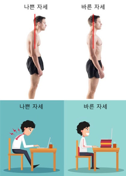 - [거북목/일자목]: 컴퓨터나 스마트폰을 볼 때 머리가 어깨보다 앞으로 5cm 이상 나와 있다.
