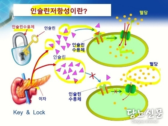 - 인슐린이 열쇠를 들고 세포 문을 찾아가도, 세포가 반응하지 않고 문을 열어주지 않는 현상입니다. 즉, **세포가 인슐린에 둔감해지는 것**이죠. 인슐린은 멀쩡히 있지만 그 신호 전달 체계가 망가진 거예요. 당연히 포도당은 세포 안으로 못 들어가고, 피 속에 계속 쌓여서 혈당이 올라갑니다.